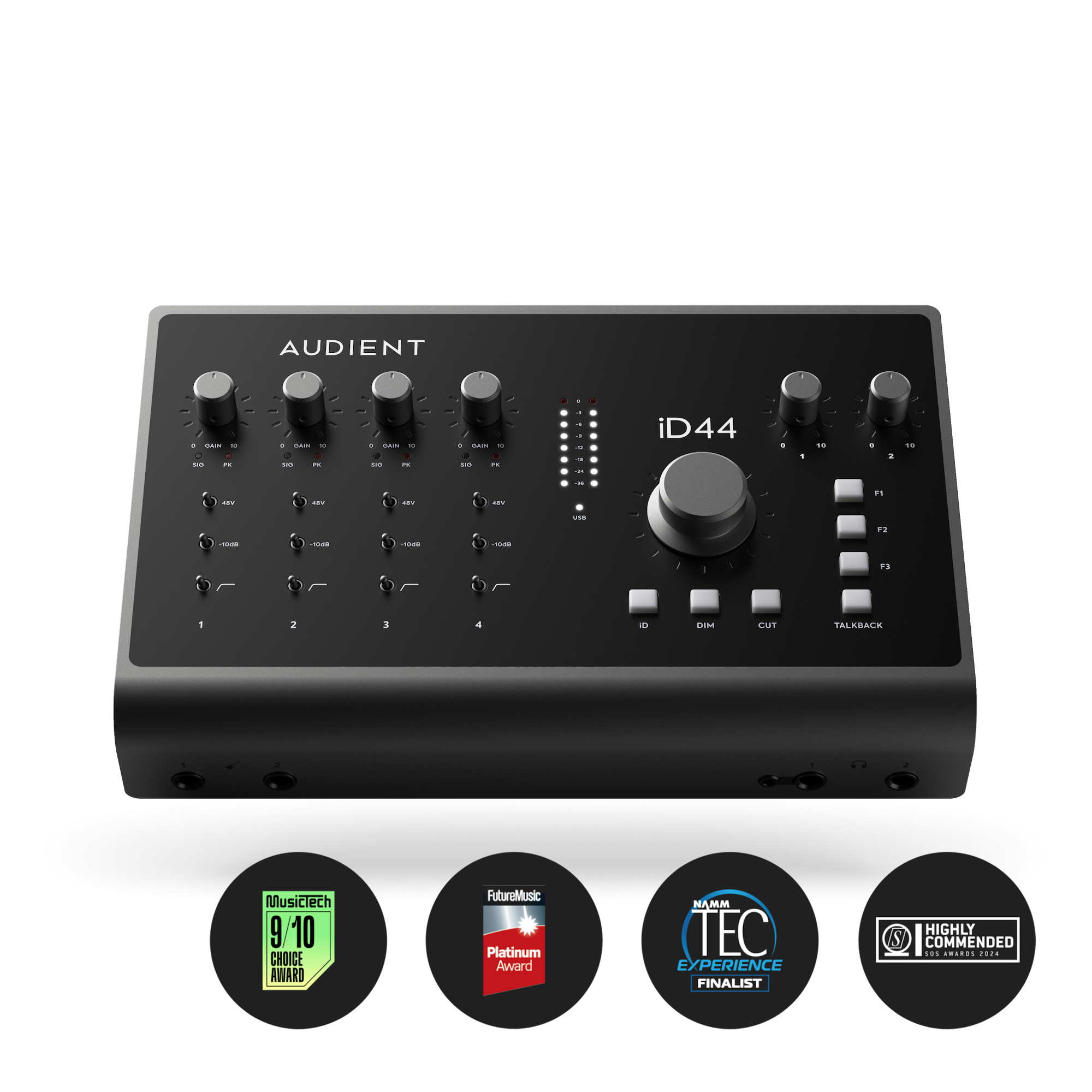 Ud over audio loop-back og en dobbelt hovedtelefonudgang, kombineret med fire Audient Console mic preamps og ADAT udvidelsesmuligheder, leverer iD44 den samme lydkvalitet som en stor Audient mixer sluttet direkte til computeren.