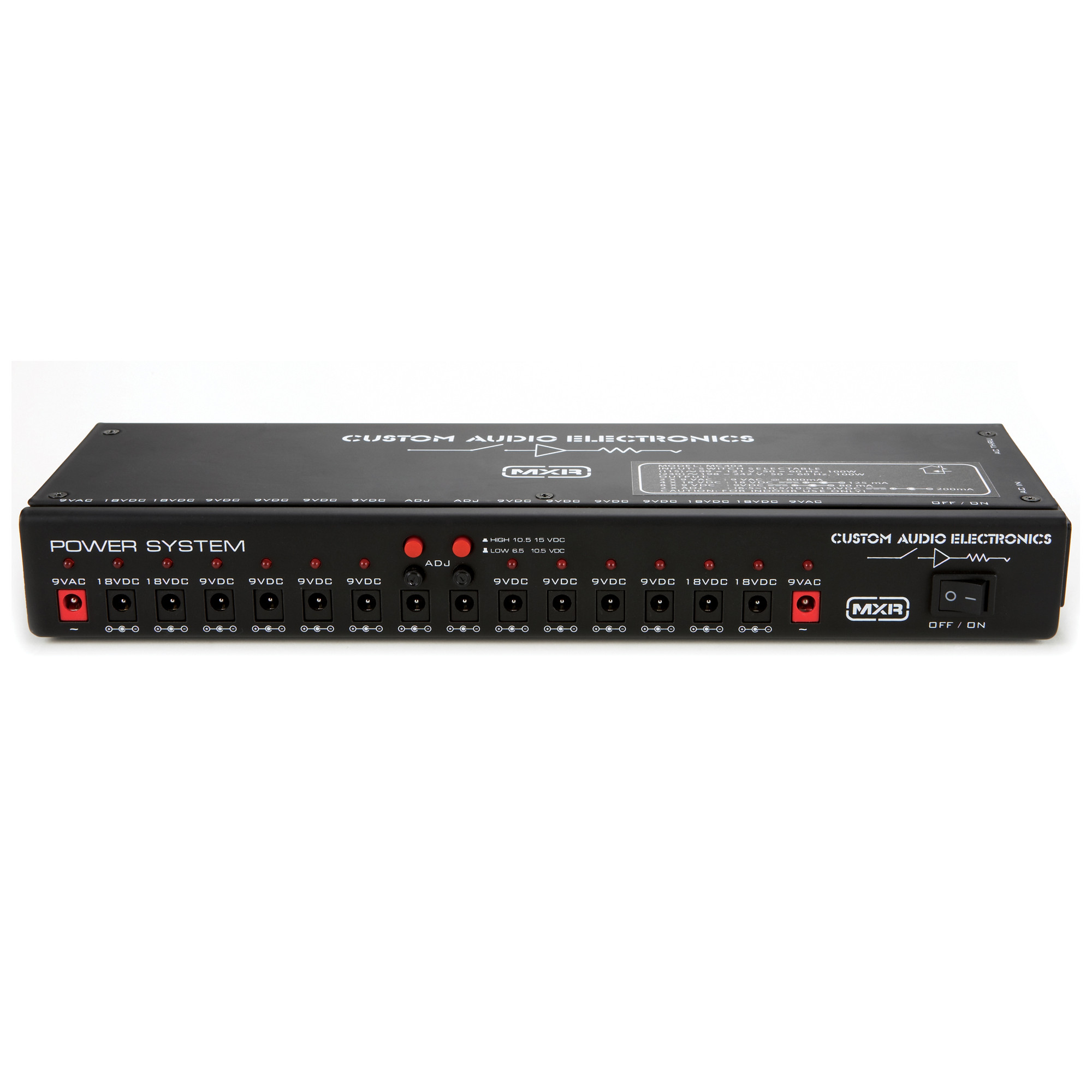 2 x 9VAC / 8 x 9VDC / 4 x 18VDC / 2x 6,5-15,0VDC (kabler medfølger)Det seneste samarbejde mellem Bob Bradshaw og MXRs designteam er den ultimative strømforsyning til musikere.