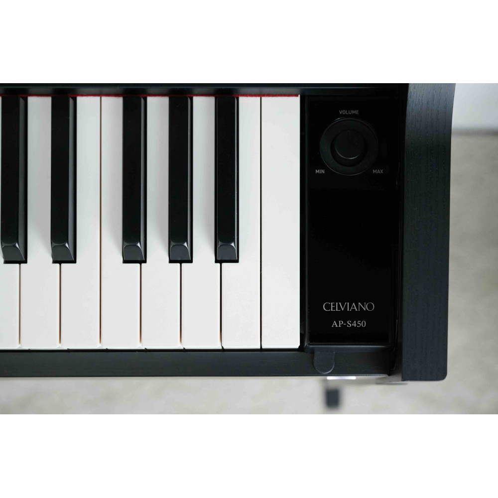AP-S450 er en fusjon av banebrytende teknologi og forfinet estetikk. Det slanke designet passer inn i alle boflater og leverer presisjon med en Smart Hybrid-tangentmekanisme som har treklaviatur.