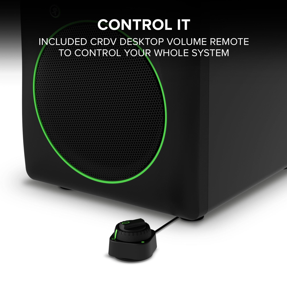 All the control you need is always within reach. Mackie CR8ST includes a CRDV desktop remote that allows for separate control of the overall system output level and subwoofer output level. You’ll never have to get up from your chair to adjust volume ever again.