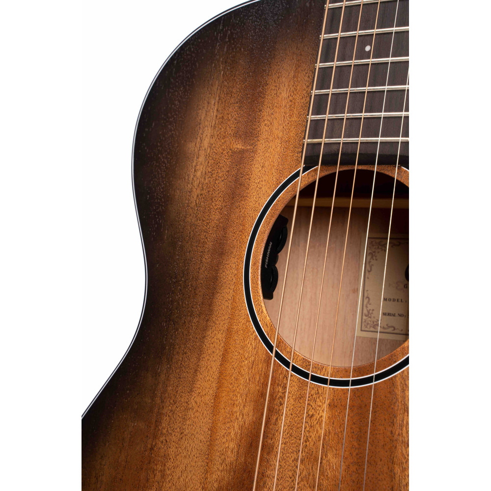 Developed in accordance with recent acoustic guitar market trends, this model features not only mahogany back and sides but mahogany top as well. Although darker sounding than spruce, mahogany produces a warmer tone with a full rich mid-range.