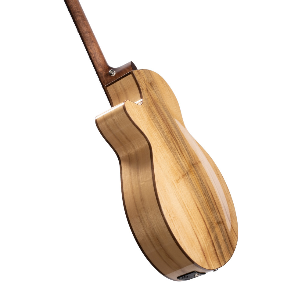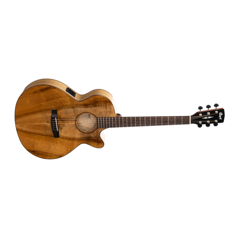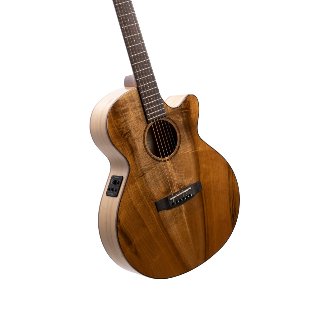 As Cort’s vision of the modern acoustic-electric, the SFX Series features Cort’s own unique slim body shape (83-83mm) with comfortable cutaway, modern V-shape neck profile and jumbo frets for enhanced playability, arched back for improved resonance, and Fishman electronics. The use of exotic wood Myrtlewood gives SFX Myrtlewood a unique look that stands out from rest of the series while enabling it to produce the bright and clear sound with clear sound projection.
