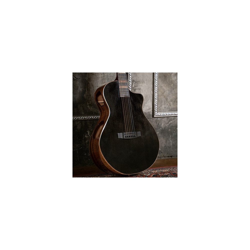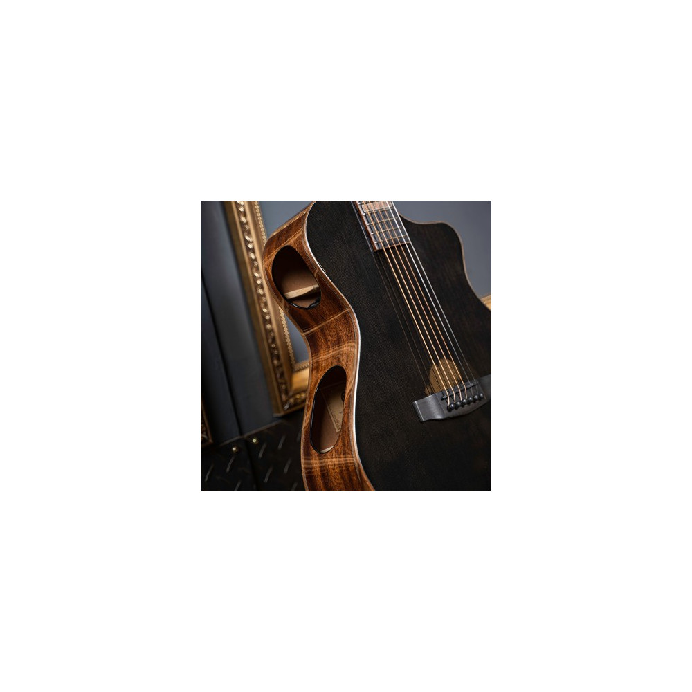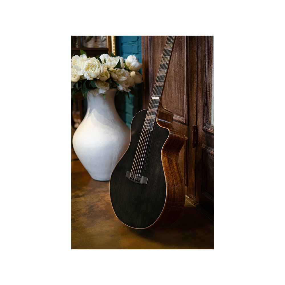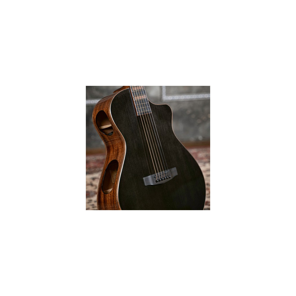 Inspired by the chic and sleek style of the modern jazz era, the Modern Black boasts unique and bold design with a blend of elegance and composure. Its body shape is a complete redesign of the conventional grand concert shape with modified curves that suits the overall styling, while maintaining superb resonance and sound quality, and the dual sound ports ensure that the sound is audible to both the player and the audience. The addition of the world-renowned Fishman® Matrix Infinity pickup / preamp system provides a clear and transparent tone when plugged in.