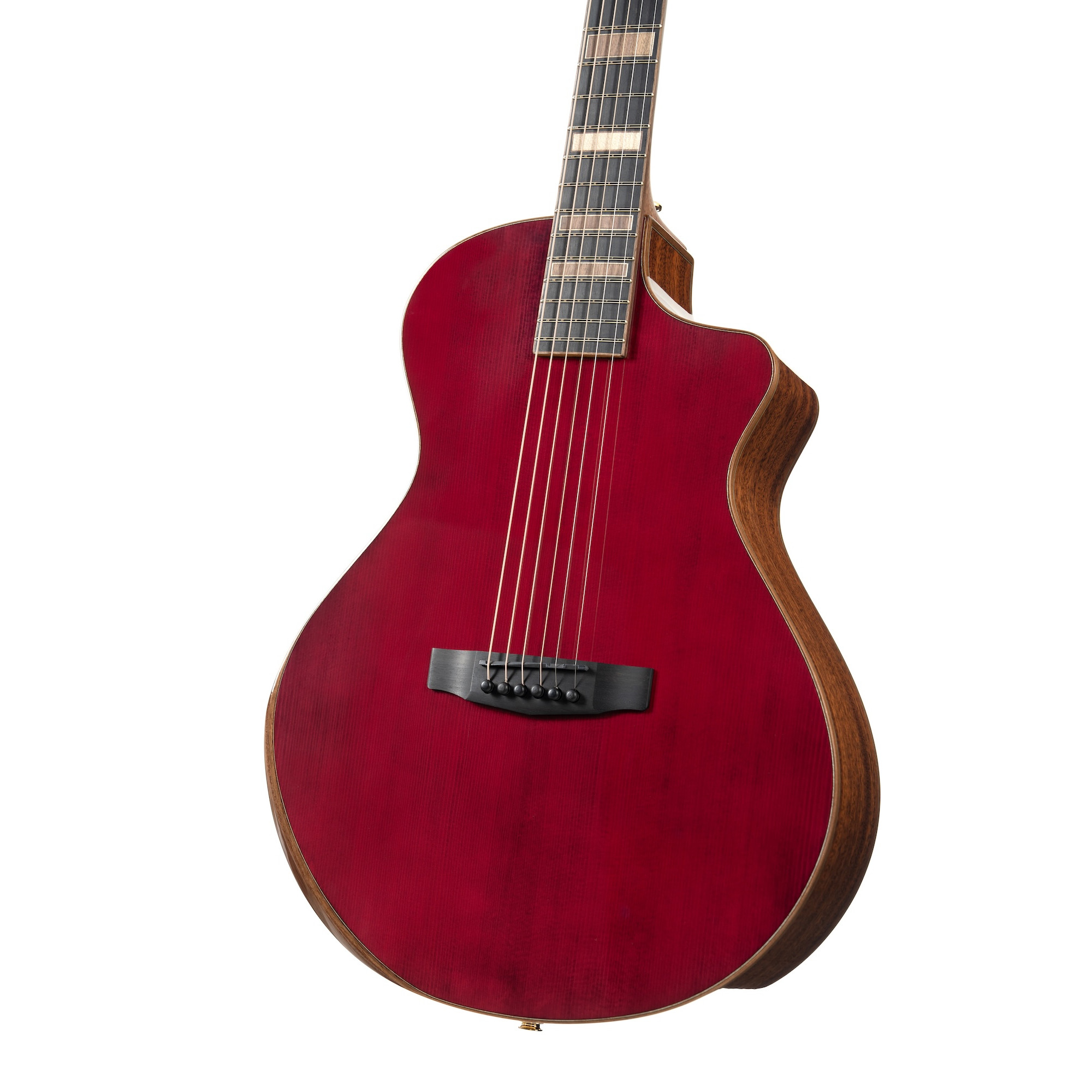 The striking burgundy finish catches your attention, then the acoustic innovation keeps it. What appears to be missing from the top—the traditional center soundhole actually represents a breakthrough in guitar design. Acoustic guitars have been essentially frozen in time since 1916, following conventional wisdom about soundhole placement. This guitar breaks from that tradition, using side-mounted ports that allow the top to vibrate more freely. The result is an enhanced tone and response that matches the sophisticated visual appeal.