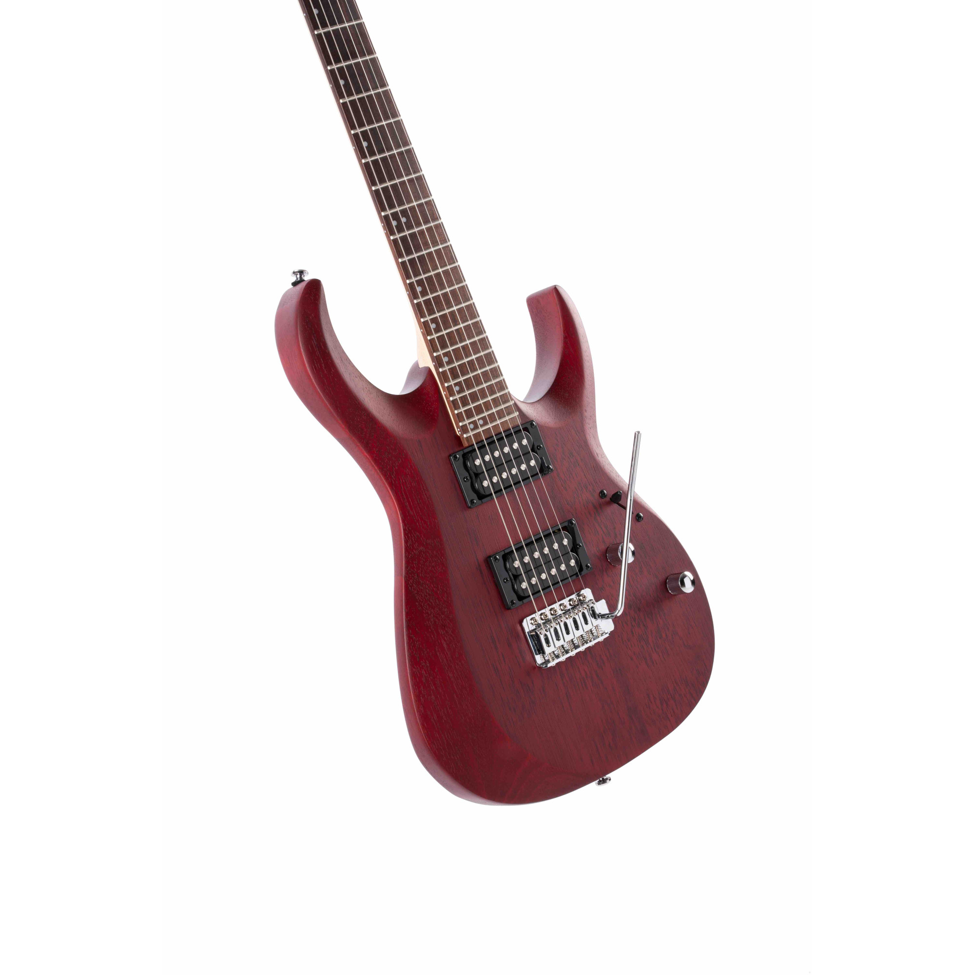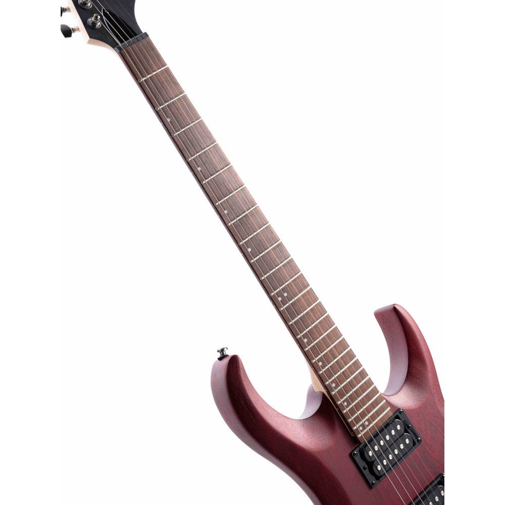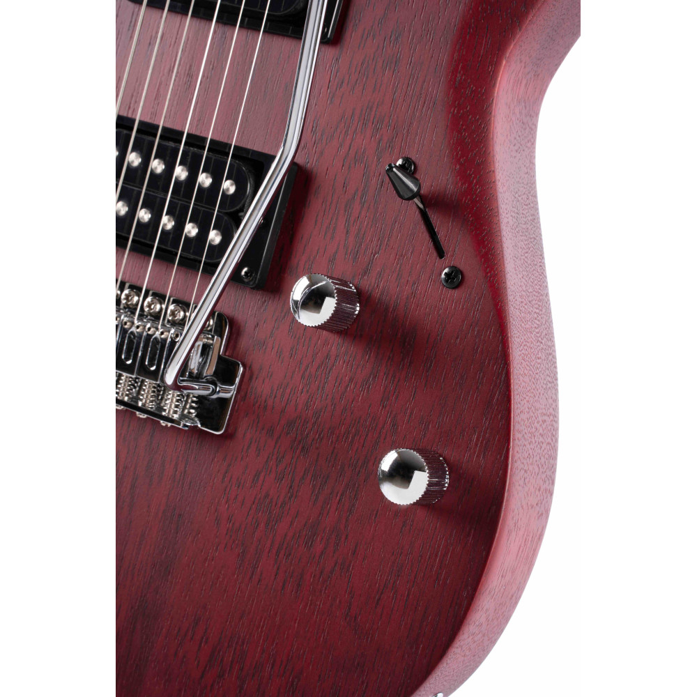 The entry level model of the new X Series, the X100 features the same slick and fast playability of the higher-end X Series models with Meranti body wood and hard rock Maple neck, Jatoba for fingerboard with 400mm(15.75”) radius, two high output humbucker pickups, and 6-point tremolo system available in three open pore finishes: Black, Black Cherry, and Black Cherry Burst.