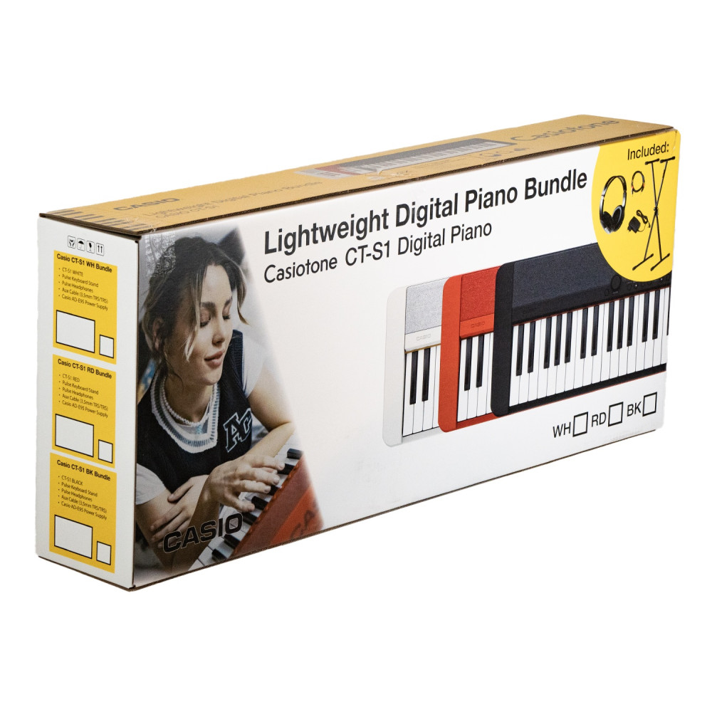Bundle med Casiotone CT-S1 lättvikts digitalpiano, keyboardställ, hörlurar och AUX-kabel. Även notställ och strömadapter medföljer.