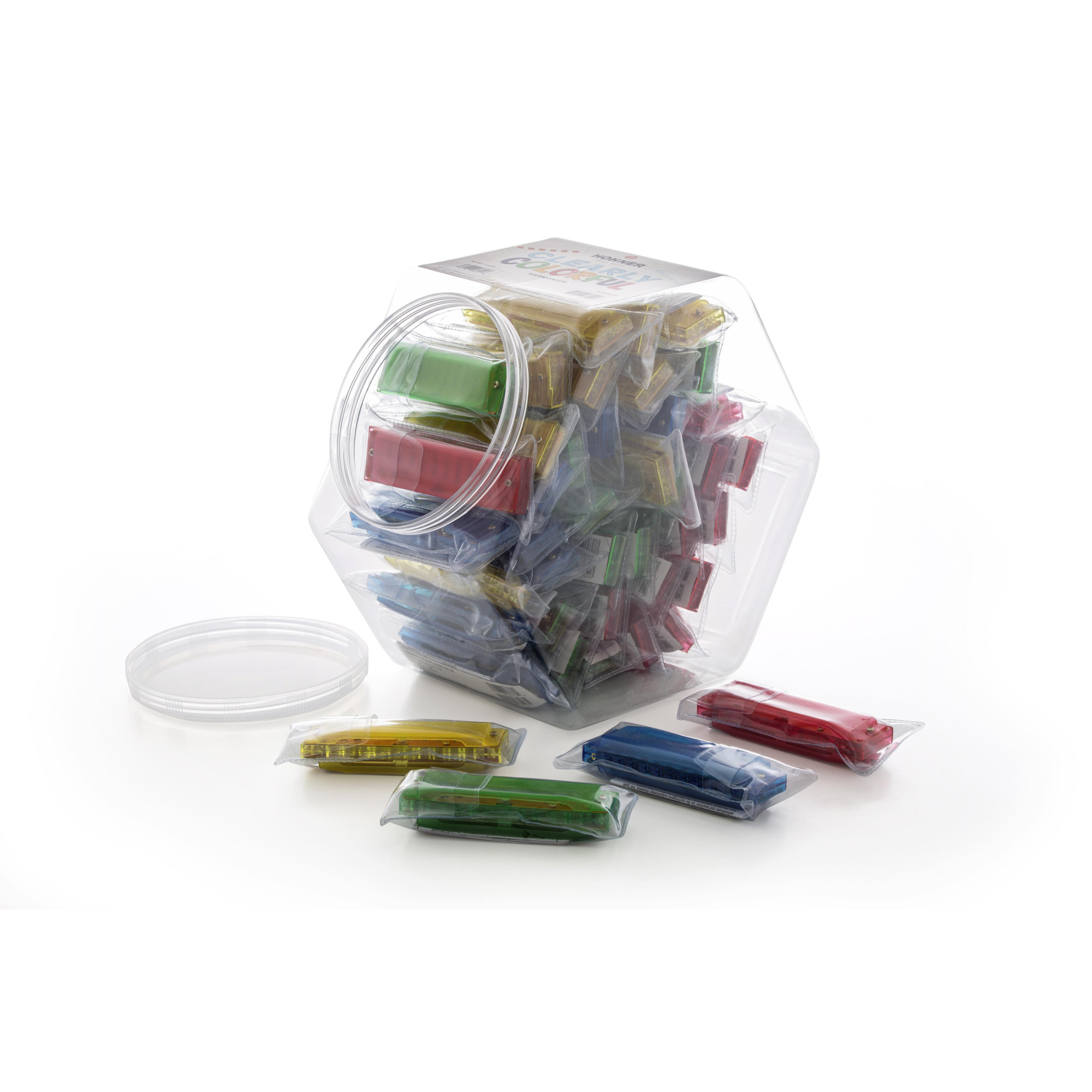HOHNER Translucent Harp Display (Canister) 12 pieces per color (ye,bl,gr,rd - total 48 pieces)