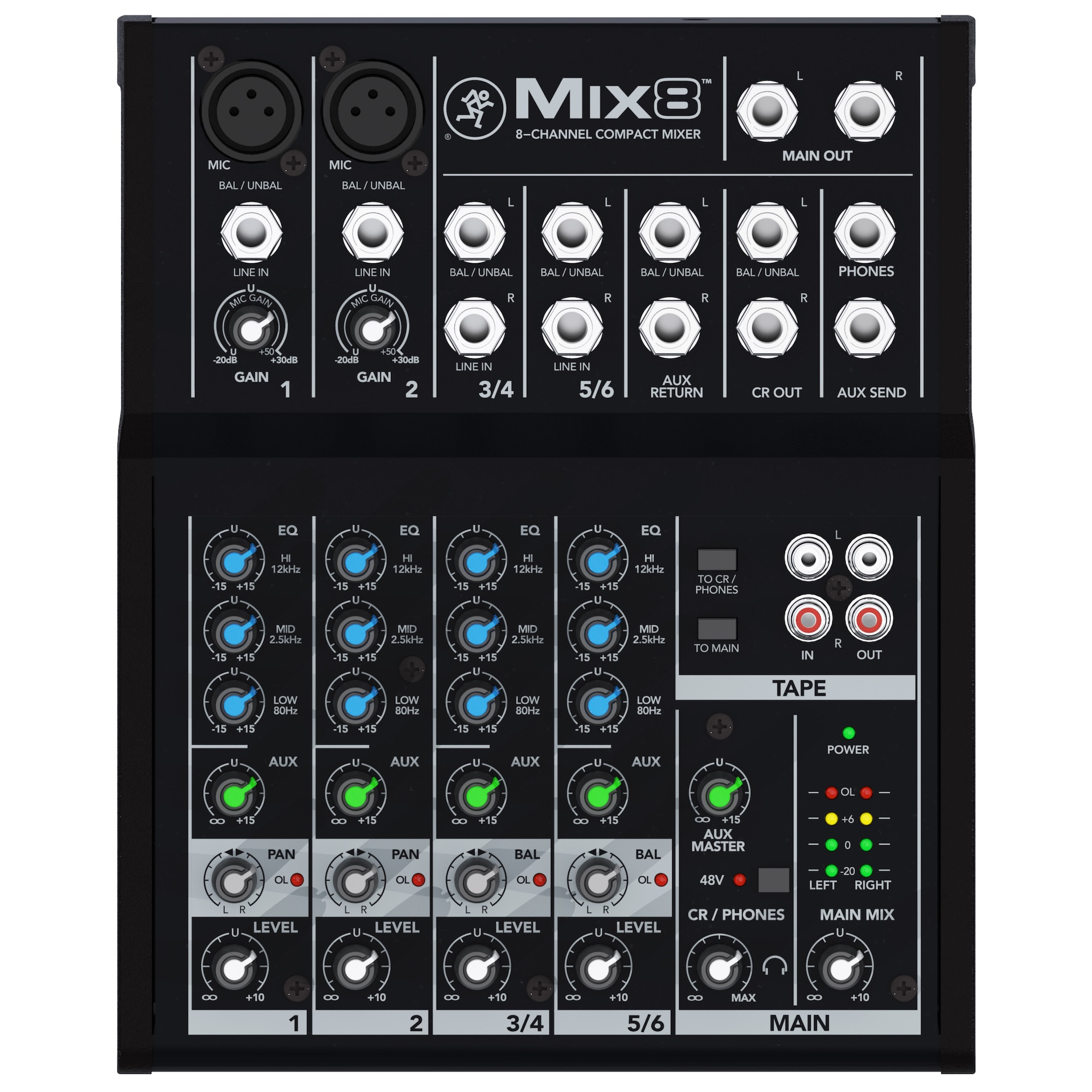 Mackie has brought professional-level compact mixers to the masses since we debuted the LM-1602 in 1988. The Mix8 is an 8-channel mixer that expands on our heritage of designing great gear that isn’t unattainable for real working musicians and content creators. Featuring our low-noise preamps, a 3-band EQ and aux sends for each channel, an RCA I/O path for recording and separate volume controls for headphones and the main monitor, the Mix8 is a versatile workhorse for creators who need more control over their audio.