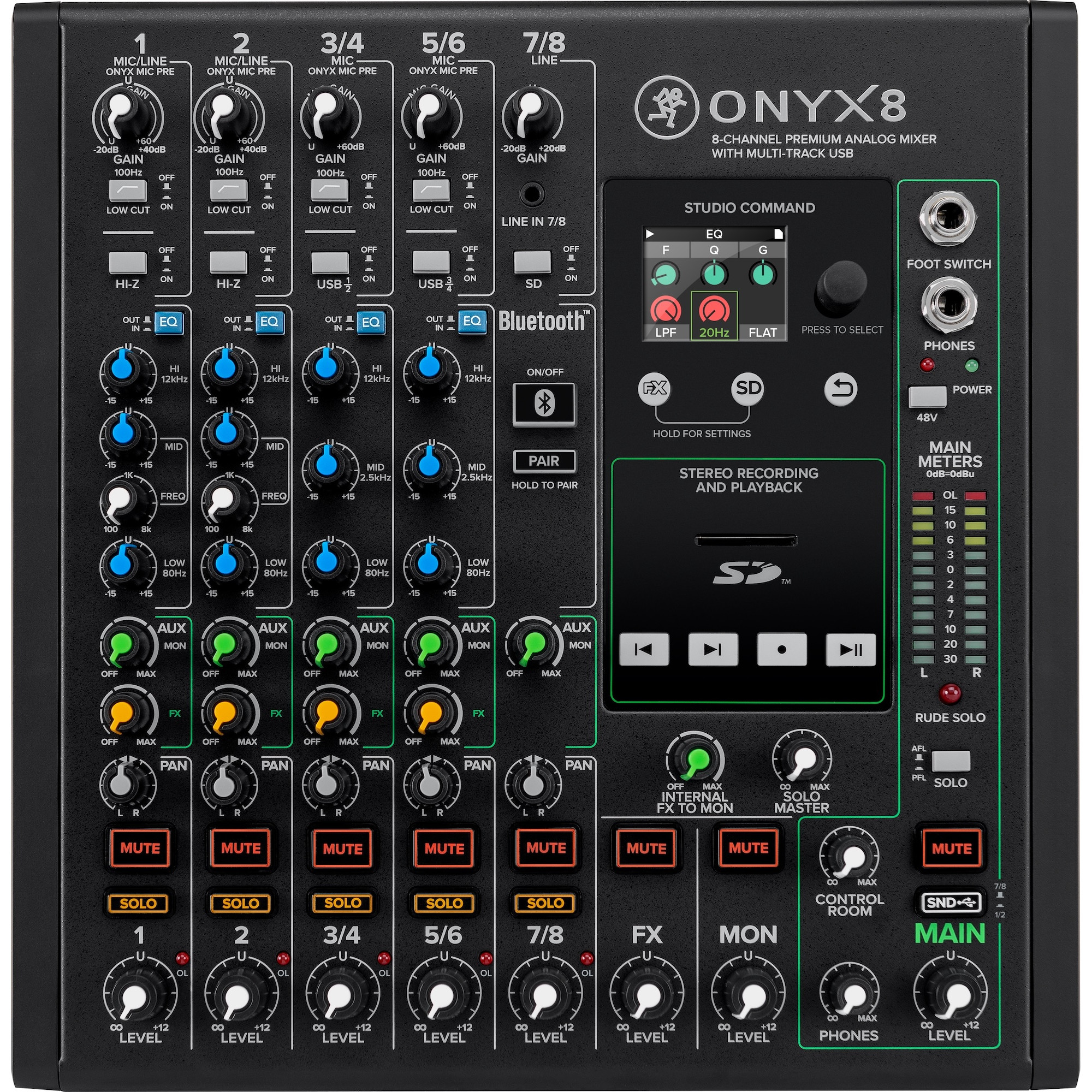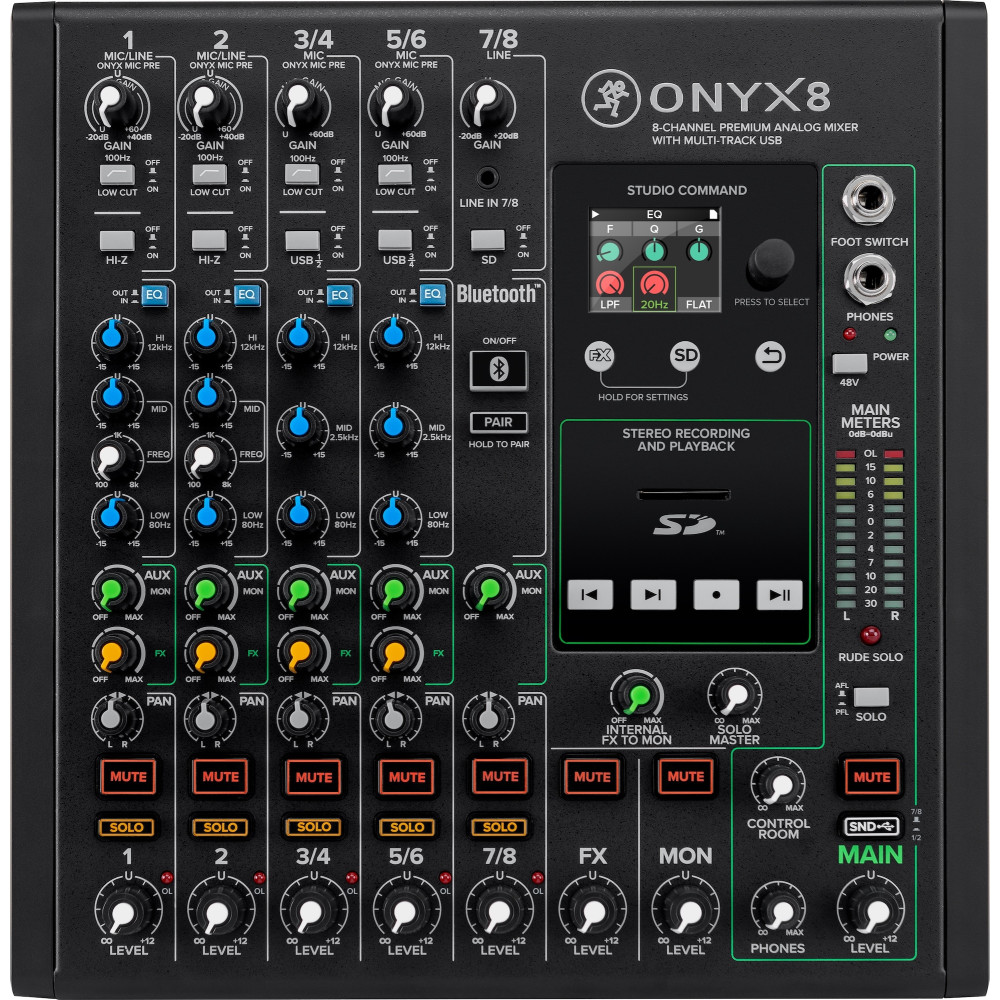 There’s nothing like feeling in control of your workstation. The Mackie Onyx8 features powerful full-color LCDs with dedicated physical transport controls. Apply FX and recall up to six customizable presets using an intuitive single-knob interface. Record a stereo mix, browse files and play music direct to/from an SD card, all via Studio Command.