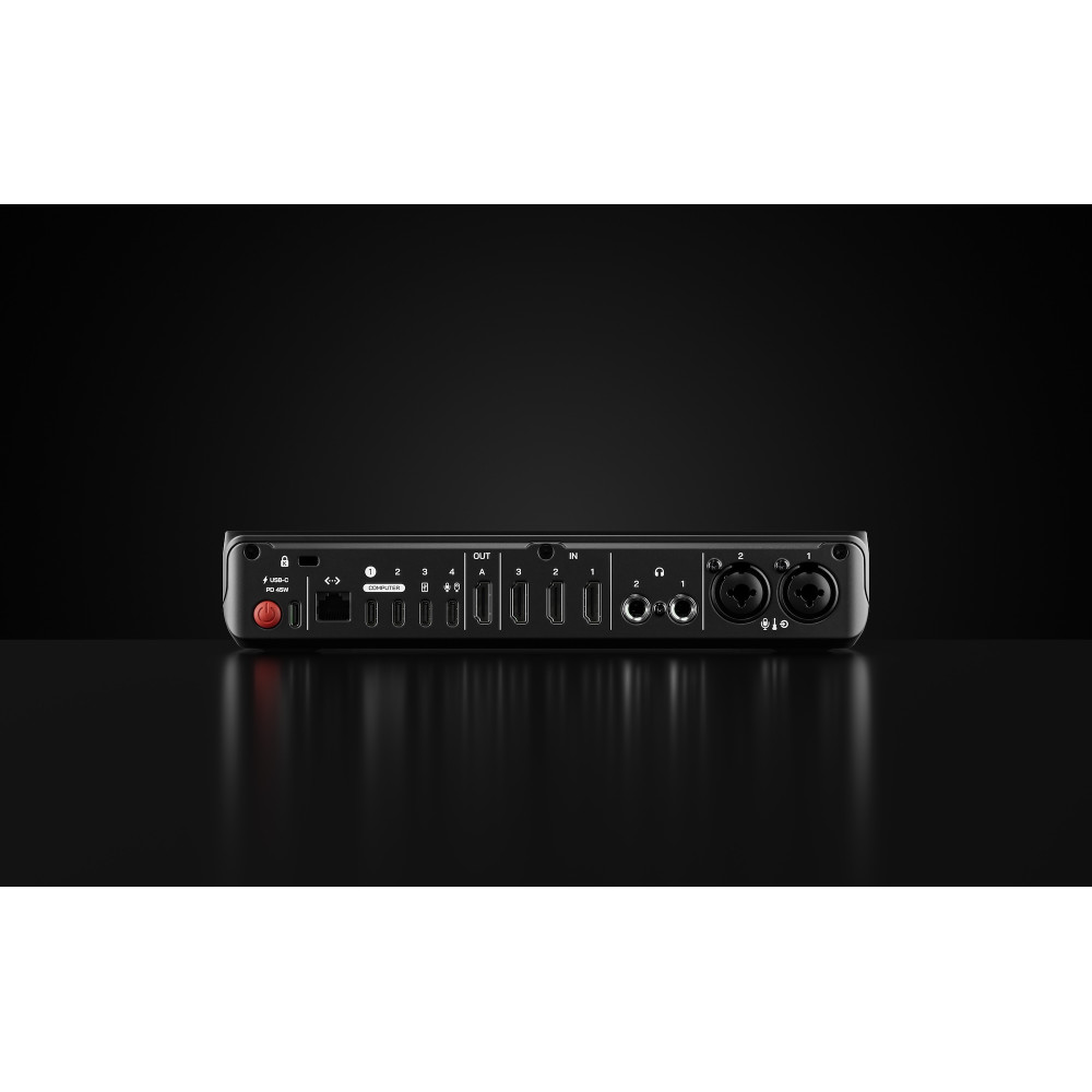 • Two studio-grade Neutrik® combo jacks with ultra-low noise, high-gain Revolution Preamps™ for capturing pristine audio from XLR microphones, instruments or any other audio source