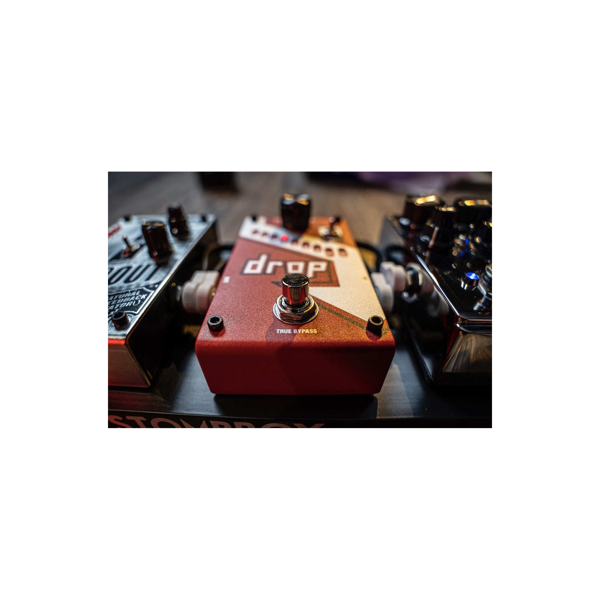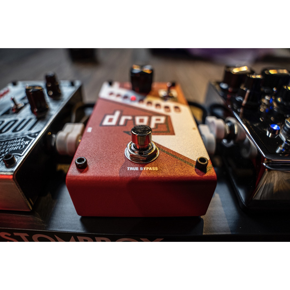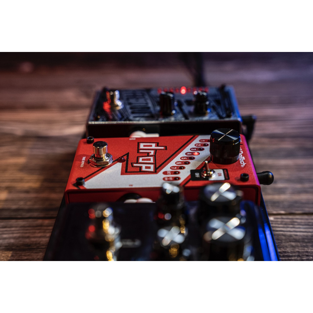 The DigiTech® Drop is a dedicated polyphonic drop tune pedal that allows you to drop your tuning from one semitone all the way down to a full octave. Get down-tuned chunk without having to change guitars! The Drop also features a momentary/latching switch. With the switch set to momentary, you can turn the Drop into a true performance pedal. Fast trills and roller-coaster pitch dips are at the tip of your toes.