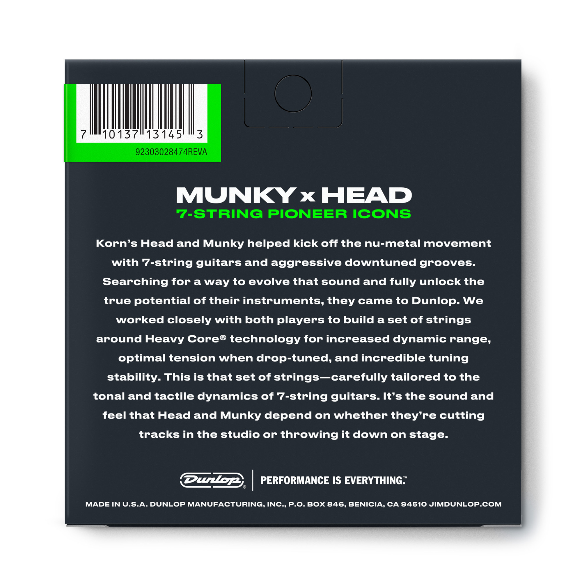 Denna uppsättning Heavy Core-strängar har utvecklats i samarbete med Head och Munky från Korn för att öka dynamiken och optimera spänningen i strängarna. Perfekt för när man stämmer ned en 7-strängad gitarr.
