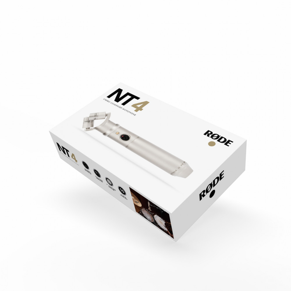 RØDE NT4 är en Stereo-kondensatormikrofon i studioklass, stativfäste, puffskydd och specialkablar som inkluderar både XLR och Minitele-kontakter. Detta gör NT4 till en fullt flexibel mikrofon som kan kopplas direkt till de flesta apparater vid studioinspelning, TV / Videoproduktioner, trumöverhäng etc.